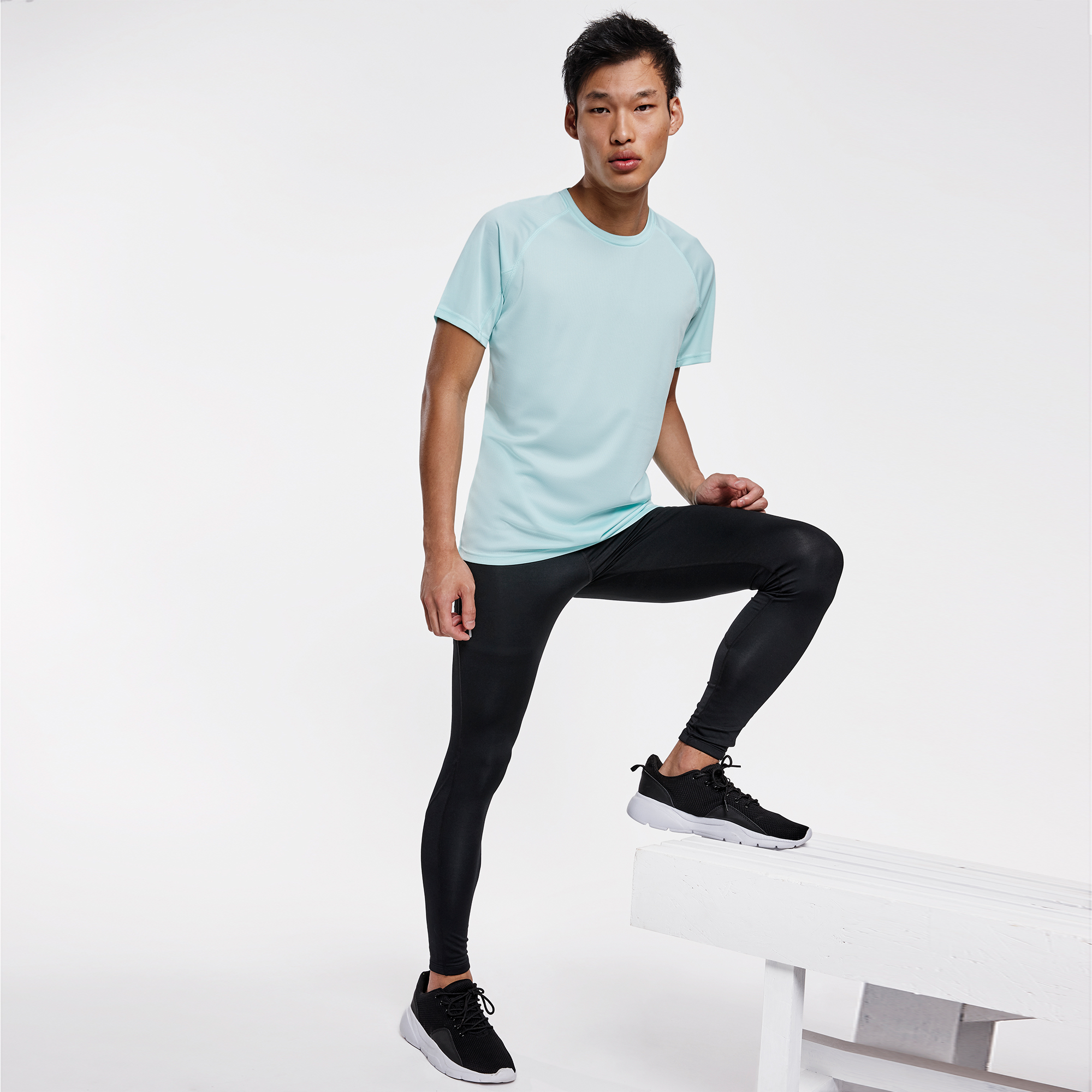 Camiseta técnica de manga corta ranglán. 1. Cuello redondo con cubrecosturas a tono. 2. Paneles inferiores en mangas. 3. Remallado a tono en sisa y panel de manga. 4. Tejido CONTROL DRY.