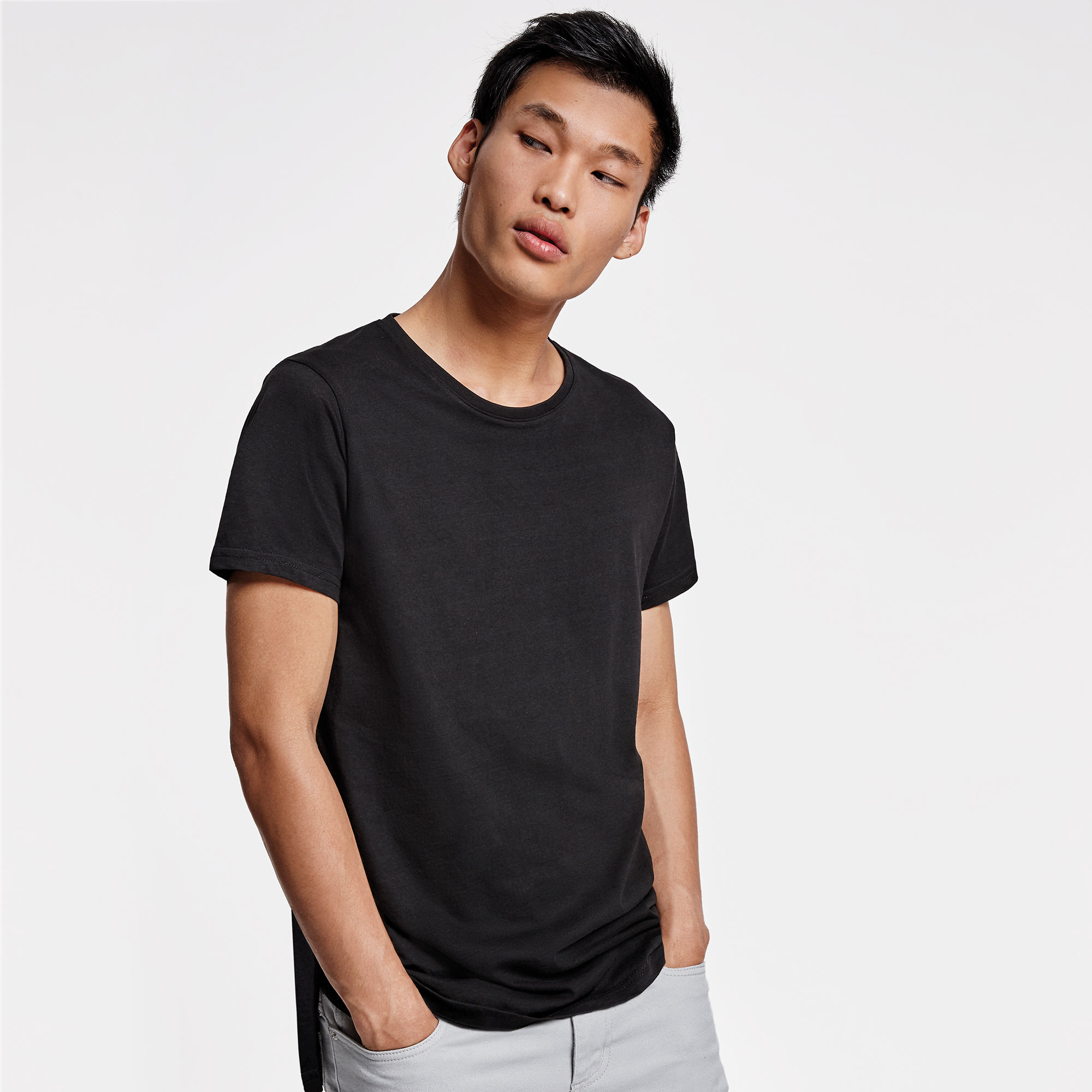 Camiseta unisex de manga corta y talle extra largo, con cuello redondo de dos capas con elastano. Aperturas laterales en el bajo. El patronaje de la espalda es ligeramente más largo que el delantero.