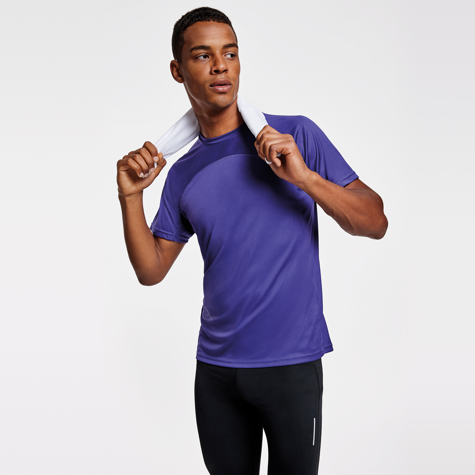 Camiseta técnica unisex de manga corta. 1. Cuello redondo con cubrecosturas de refuerzo a contraste en color amarillo flúor. 2. Combinada en espalda con dos tejidos de poliéster.