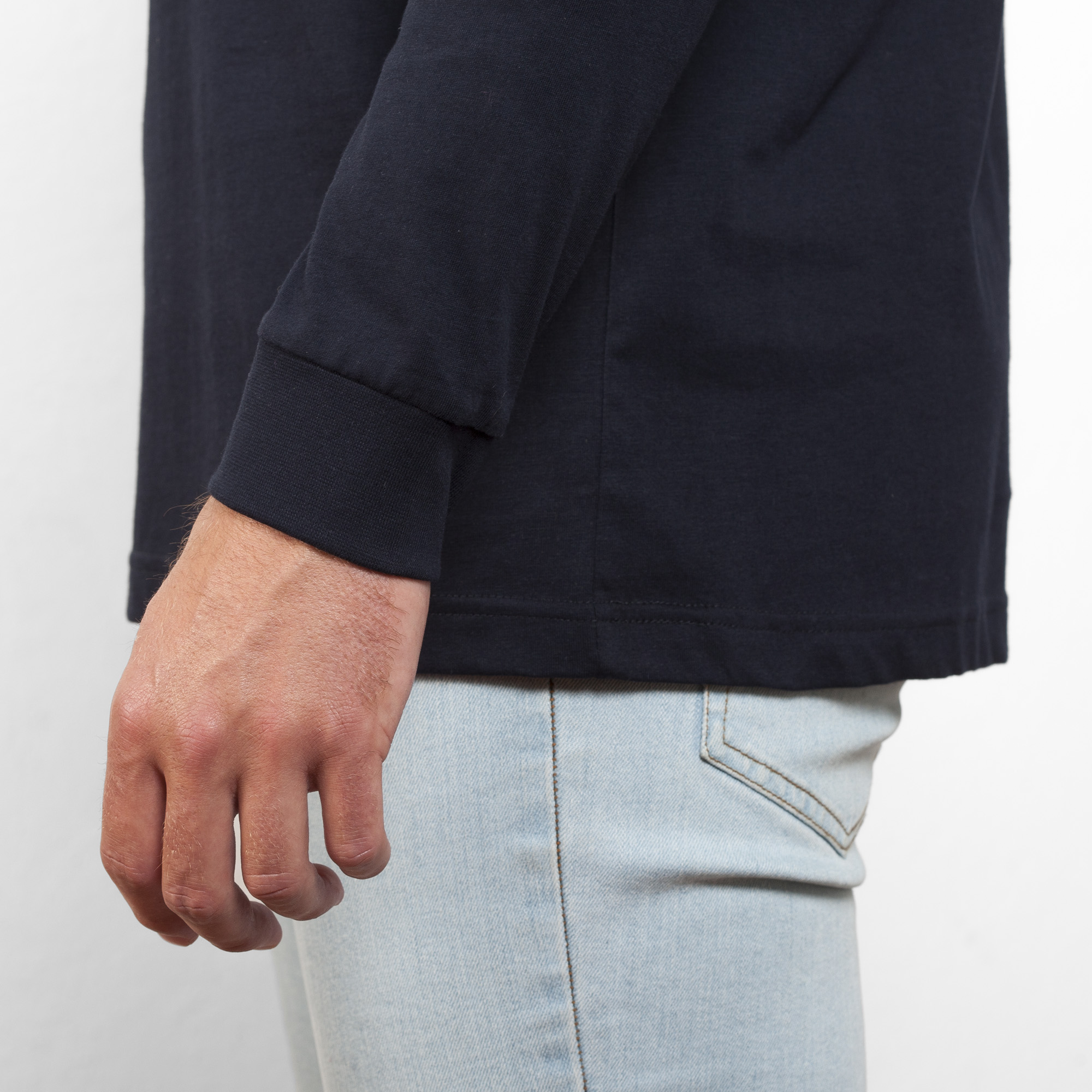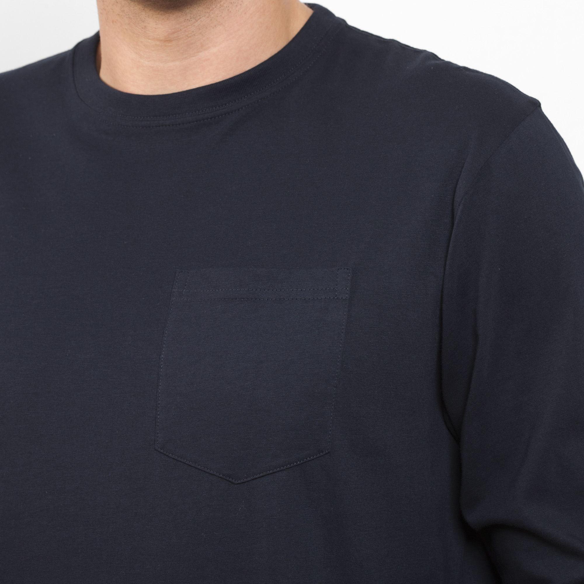 Camiseta de manga larga con cuello redondo y puños en canalé 1×1. Bolsillo en pecho izquierdo. Cubre costuras reforzado en cuello y hombros.